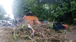 Pantauan Prosalina FM di lapangan, korban bersama kerabatnya masih membersihkan warung yang ambruk serta sisa dagangannya yang tertimpa pohon. (Hafit)